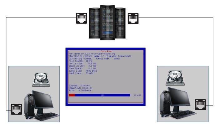 Un serveur Fog permet de faire une "capture" d'un disque dur afin de créer une image type, qu'on pourra ensuite déployer sur d'autres postes, à condition qu'ils soient sur le même réseau local que le serveur. Cela permet d'avoir plusieurs postes identiques, avec les mêmes fichiers, mêmes configurations.
