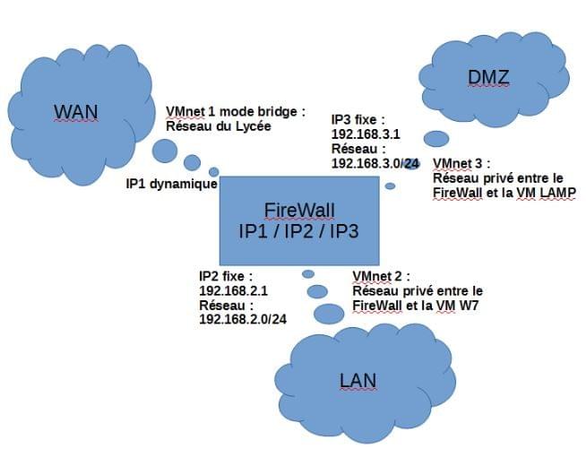 Lors de ce PPE, il fallait mettre en place 3 machines virtuelles (Une machine avec le système d'exploitation IpFire qui est le firewall, une machine sous Windows représentant le LAN d'une entreprise, et une machine Ubuntu représentant la DMZ.) Il a fallu ensuite interconnecter les réseaux de manière sécurisé et tester le bon fonctionnement grâce a un ordinateur sous Windows représentant le WAN.